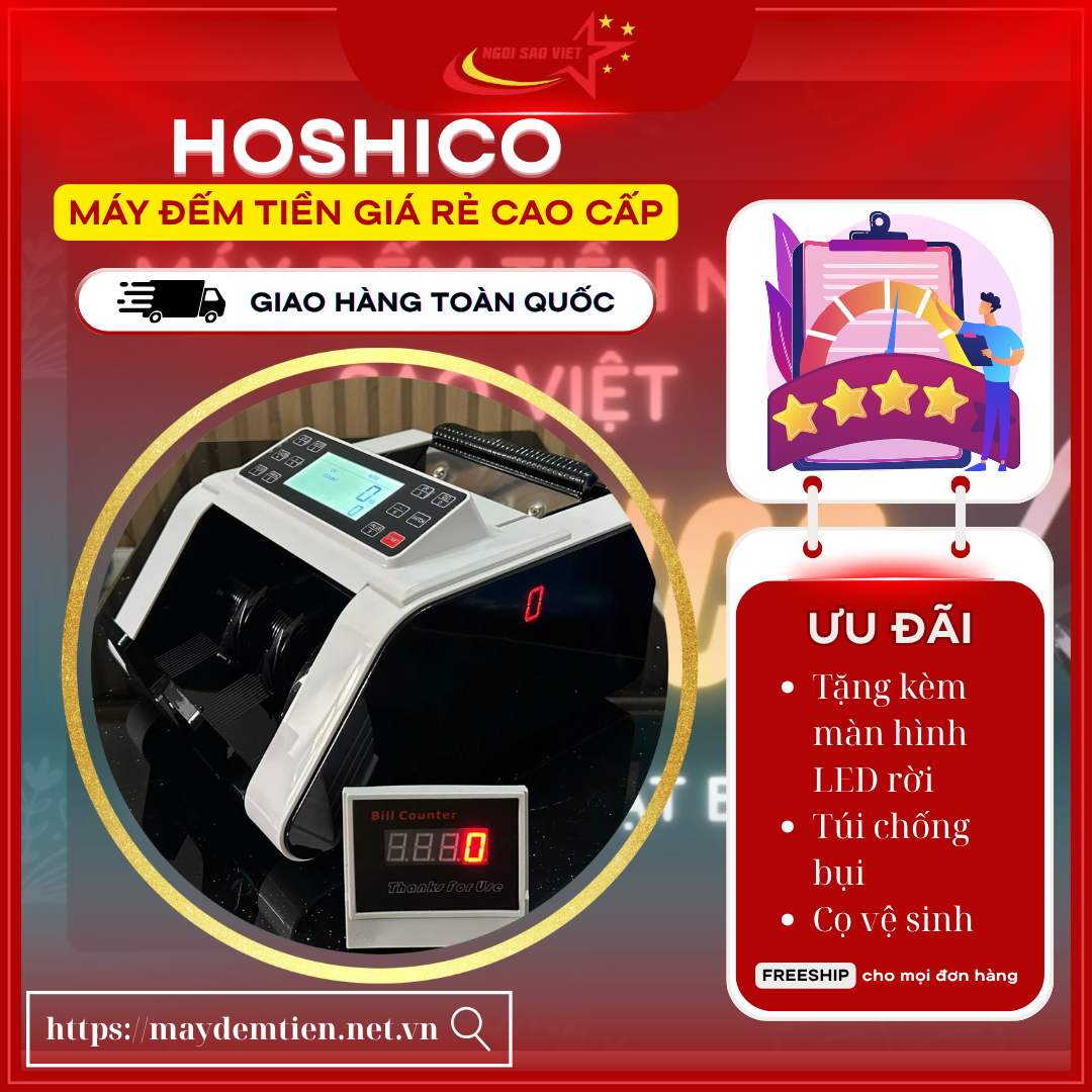 Máy đếm tiền Hoshico thương hiệu Nhật Bản, chất lượng cao uy tín hàng đầu được phân phối độc quyền bởi CTY TNHH XNK TMDV Ngôi Sao Việt. Thiết kế đa dạng, nhỏ gọn phù hợp không gian làm việc. Tính năng hiện đại có thể kiểm đếm tiền giấy, Polymer, ngoại tệ (USD, EURO, JPY, KRW, CAD,..), khả năng kiểm tra tiền kém chất lượng (tiền giả, tiền tẩy mực, tiền rách). Địa chỉ 85/4 ấp 7 xã Bà Điểm, Tp Hồ Chí Minh. <br>Giao hàng miễn phí toàn quốc <br>⌛️ Bảo hành lâu dài <br>Sửa máy đếm tiền tận nhà <br>Hotline/Zalo: 0907.12.94.12 (Mr Thành) - Để được tư vấn chi tiết <br>Liên hệ ngay để tư vấn trực tiếp sản phẩm